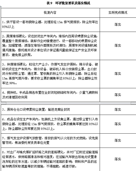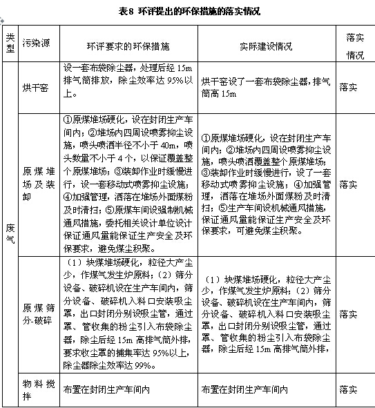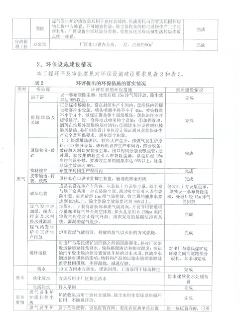 2016年9月委托晉城市綠和環(huán)保技術(shù)咨詢有限公司編制了《沁水縣誠友型煤有限公司年產(chǎn)10萬噸型煤項(xiàng)目環(huán)境影響報(bào)告表》,報(bào)告表中要求的主要環(huán)保措施及落實(shí)情況如下: