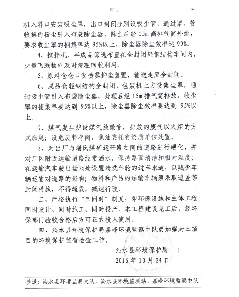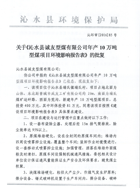 2016年10月24日,沁水縣環(huán)境保護(hù)局以沁環(huán)審[2016]85號文對該項(xiàng)目環(huán)境影響報(bào)告表進(jìn)行了批復(fù)。