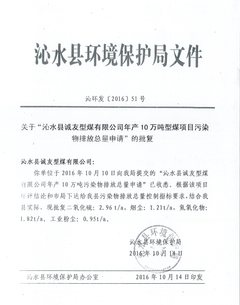 根據(jù)《山西省環(huán)境保護(hù)廳建設(shè)項(xiàng)目主要污染物排放總量核定辦法》晉環(huán)發(fā)[2015]25號文件,總量核定指標(biāo)不包括無組織排放量,由以上分析知本項(xiàng)目總量控制指標(biāo)為:粉塵0.95t/a,煙塵1.21t/a,SO2 2.96t/a,NOX 1.82t/a。2016年10月14日沁水縣環(huán)境保護(hù)局以沁環(huán)發(fā)[2016]51號文對該項(xiàng)目總量進(jìn)行了批復(fù)。本項(xiàng)目運(yùn)營期落實(shí)環(huán)評要求后可以滿足沁水縣環(huán)境保護(hù)局對本公司下達(dá)的總量控制指標(biāo)。