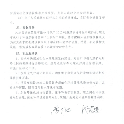 綜上所述,沁水縣誠友型煤有限公司在建設(shè)過程中已基本落實(shí)了環(huán)評及其批復(fù)要求,符合驗(yàn)收條件和要求,可以予以驗(yàn)收。